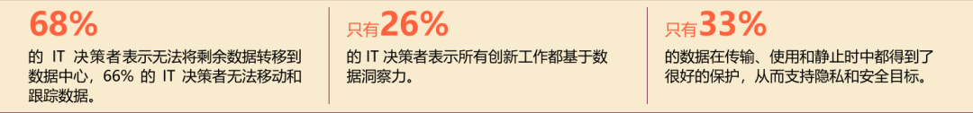 发挥数据价值的先决条件之一是企业内部数据安全可用。在过去几年,数据安全问题愈演愈烈,据戴尔创新指数调研数据,只有33%的受访者表示他们能够在传输、使用和存储时保障数据的安全。