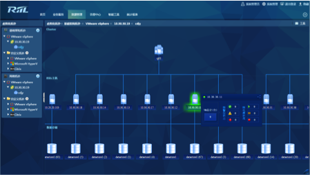 其次,利用RIIL的虚拟化云平台管理,技术人员实现了VMware下的统一资源管理。通过Vcenter随时了解ESXI主机和VM主机的运行状态分布、ESXI主机、VM主机及数据存储主机各类指标信息、存储设备状态。另外,RIIL还能通过图形化的方式追溯虚拟平台的互联架构,将“黑匣子”内的数据彻底解密,实现了虚拟化平台下的精细化管理。