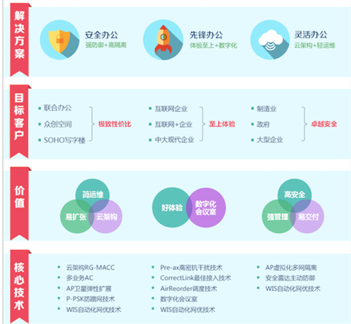 在创新创业的浪潮中,移动办公正在降低固定办公空间的必要性,同时移动技术也改变了办公空间的提供方式,因此使得一些别具风格的联合办公空间出现了巨大的市场需求。针对采用联合办公、众创空间、写字楼、SOHO办公的中小企业来说,无线网络建设要兼顾体验、运维和安全,不仅成本过高,人员工位流动的情况也让无线AP部署位置很难满足业务需要。与此同时,市面上涌现了一批Wi-Fi密码共享的软硬件产品,Wi-Fi密码变得不再神秘,中小企业的无线网络需要更强壮的认证机制。