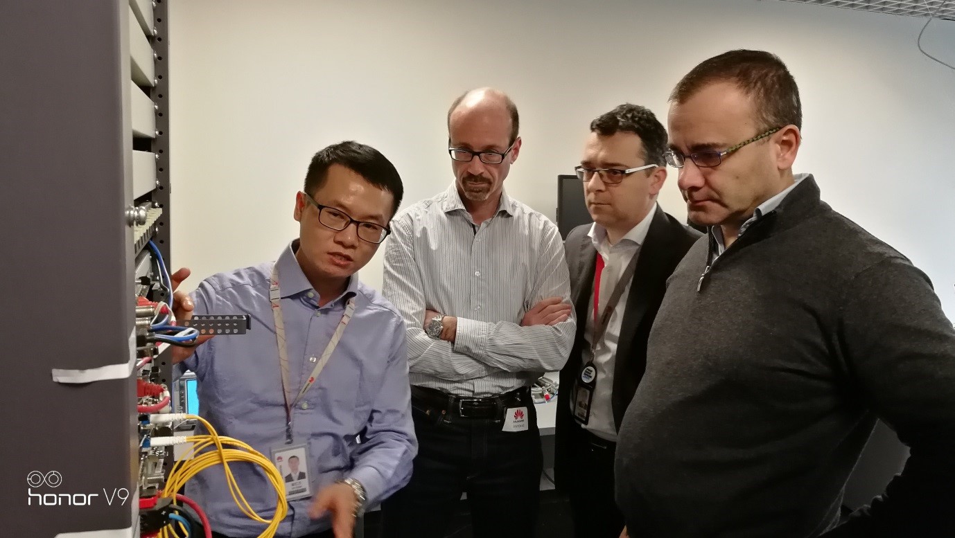 (左起)华为解决方案测试工程师梁红万,Vodafone IP架构传输高级工程师Paolo Agabio,华为营销专家Gianluca Sanità,以及Vodafone微波专家Gabriele Ferrari共同参与了此次5G微波回传测试。