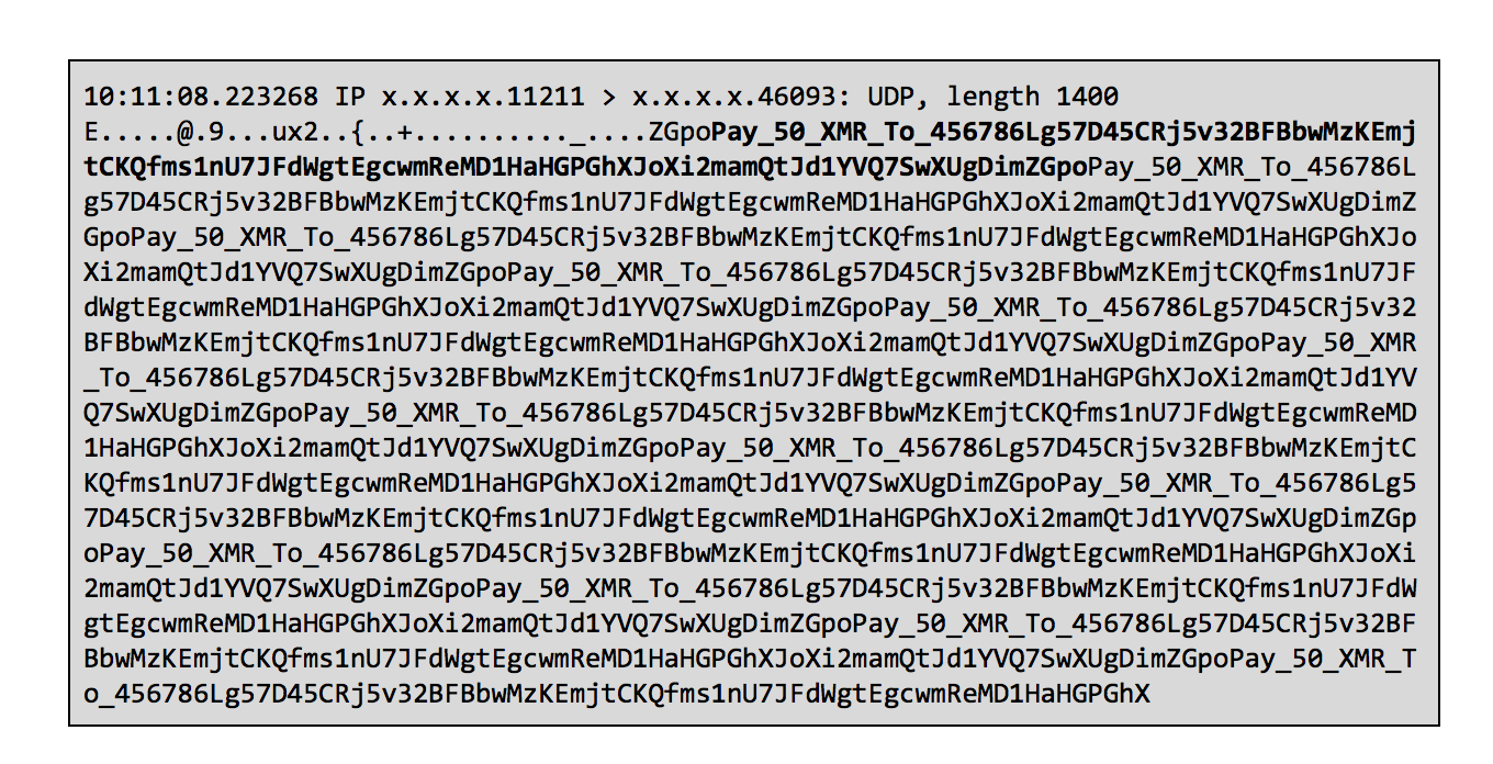 这些攻击payload是在针对Akamai Prolexic Routed平台上多个客户的实时攻击期间捕获的。如果仔细观察,可以发现埋藏在攻击流中的显然就是勒索企图。攻击者坚持要求受害者向邮件中明确提供的钱包地址支付50个(16,000美元)Monero(XMR)。这似乎与勒索电子邮件中使用的类似策略一致。他们全面撒网,目的就是希望有受害人上当支付赎金。
