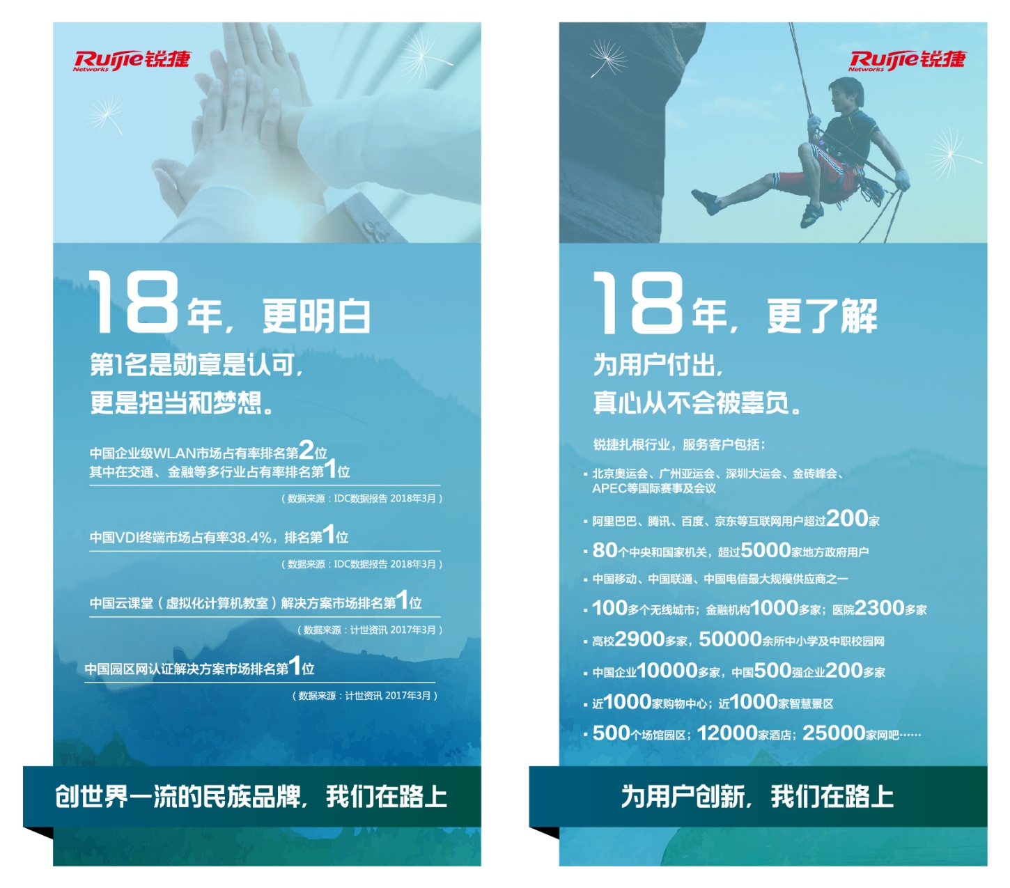 如今,锐捷网络在金融、能源、政府、企业、教育、医疗、交通、制造等多场景实现了自我超越和全面突破,并取得令人瞩目的成绩。同时,锐捷网络持续创新、打造爆品,在众多技术领域树立了新标杆。IDC数据显示,截至2018年3月,锐捷网络在中国企业级WLAN市场排名第二,在交通、金融等细分市场稳居第一。此外,在VDI终端、云课堂、园区网认证解决方案等市场,锐捷网络均位列第一。