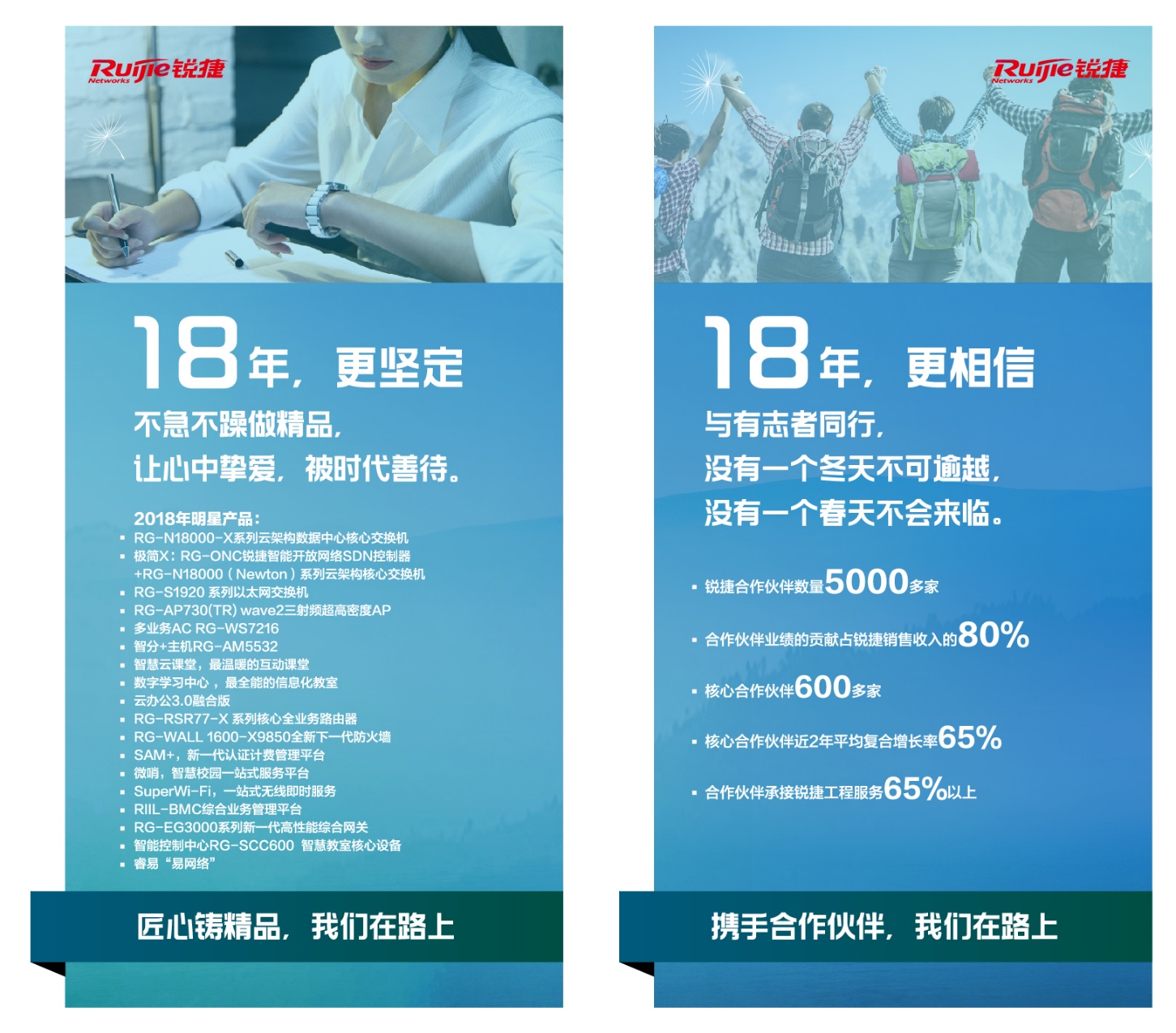 2018年,中国ICT市场规模将超过7200亿美元,以ICT最新技术为引领的数字化转型将成为所有行业的主流趋势。锐捷网络将携手众多合作伙伴,利用最新的技术变革,充分发挥自身的优势,与合作伙伴强强联手、协同创新,在数字化转型、消费升级的进程中抓住更多的商机,实现高速增长,一起做精做强,共赢春天!