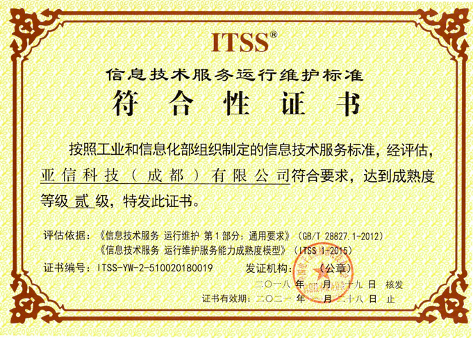 近日,经过中国电子工业标准化技术协会信息技术服务分会(简称ITSS分会)评估、确认,亚信安全于通过了ITSS运行维护服务能力成熟度二级认证,这标志着亚信安全建立的运维管理体系、过程执行与跟踪流程获得了国家最高权威部门的充分认可,能够面向客户提供高质量运维服务。