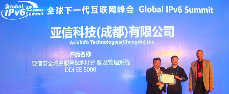 在近日举办的全球下一代互联网峰会上,全球IPv6测试中心正式宣布亚信安全获得IPv6 Ready第二阶段核心协议(Phase-2)金牌认证,标志着亚信安全互联网接入控制DDI产品在IPv6一致性以及互联互通方面符合IETF IPv6相关RFC标准,更符合《推进互联网协议第六版(IPv6)规模部署行动计划》,可实现成熟的商业部署及应用,是DDI产品在IPv6商用上迈出的重要一步。全球IPv6论坛主席Latif Ladid以及IPv6高度化推进委员会主席Hiroshi Esaki向亚信安全颁发了荣誉证书。