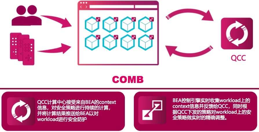 划下重点,COMB包含QCC和BEA,QCC(Queen Compute Center)是一个安全智能大脑,Queen指蜂后,进行收发指令,统筹全局。而BEA(Bee Enforce Agent)全称蜜蜂强制控制代理,与真实的蜂巢运作类似,即在每一个虚拟机里放置一只蜜蜂,不断收集当前虚机内的变化信息并向蜂后报告。