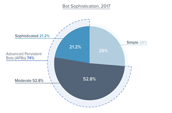 根据Distil发布的《2018恶意机器流量报告》,2017年间,恶意机器流量同比上年增加9.5%。而其中,超过70%的恶意机器请求可以通过使用模拟器、伪造浏览器环境、随机变化IP地址等手段,模拟正常人类行为发起攻击。这类被称作高级持久机器人AdvancedPersistentBots(APBs)的恶意请求正持续困扰着大量网站。