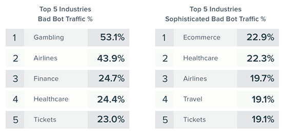 在恶意机器人攻击普遍出现于各行各业的同时,电商、医疗、航空、旅行、票务等特定行业则受到了高级机器人攻击的更多偏爱,针对它们的攻击呈现出更激烈、更专业化的特征。