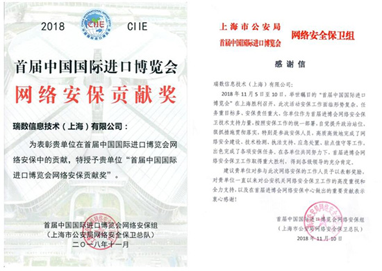 瑞数信息被授予“首届中国国际进口博览会网络安保贡献奖”,并收到来自上海市公安局网络安全保卫总队的感谢信。