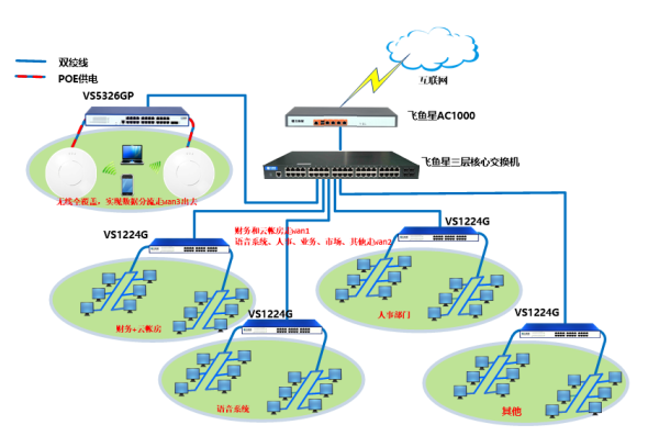 在网络的核心层,选用VS5956G三层万兆交换机作为核心汇聚交换机,可针对网络中不同部门和业务划分不同VLAN,从而实现业务隔离,同时也作为DHCP服务器向内网终端分配IP,而在接入层,则选用VS1224G连接内网中各部门的有线重点,实现数据的交互和传输。
