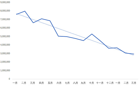 2018 年加密劫持的攻击活动有所减少(加密劫持量下降 52% ),但网络犯罪分子依旧十分热衷于这种入侵方式。相比2018 年 2 月 的峰值 800 万次,2019 年 3 月加密劫持活动总数低于 300 万,尽管在数据上有所在下降,但是加密劫持活动依然活跃。