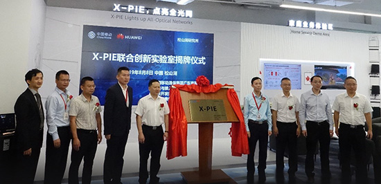 东莞移动总经理周济雄(左五)、华为松山湖研究所所长张来发(右四)、华为接入网总裁周军(左四)、华为广州代表处运营商业务部部长张兵(右二)为X-PIE联合创新实验室揭牌