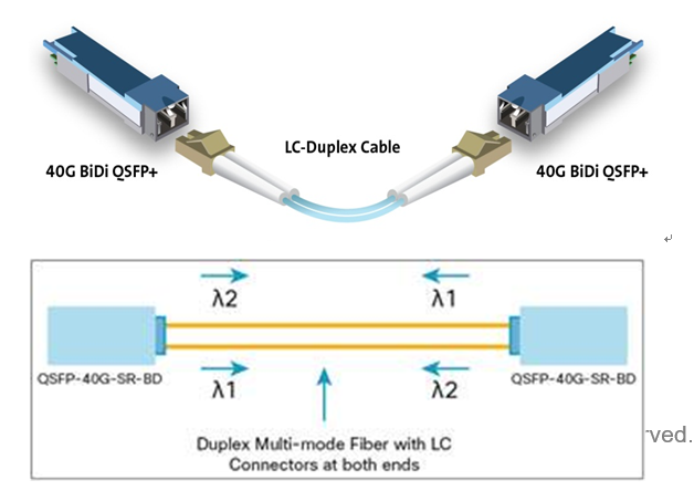 目前市场上有两种基于多波长复用技术的产品。一种是BiDi(Bi-direction)技术,如下图(以40G为例)所示,光模块有两个20 Gbps的双向通道,每根光纤都具有发送和接收功能(多模光纤支持850nm和900nm两个波长),最终在2根光纤上实现了40G 传输,且无需额外安装MPT 连接器。值得注意的是,由于BiDi 收发器的每根光纤既传输又接收信号,所以不支持端口分支功能。另一种技术是短波分复用(SWDM)技术。与BiDi 类似, SWDM仅需要一个两芯LC 双工连接,不同的是SWDM 需要工作在850nm 到940nm 之间4 个不同的波长上,其中一根光纤用于传输信号,另一根用于接收信号。