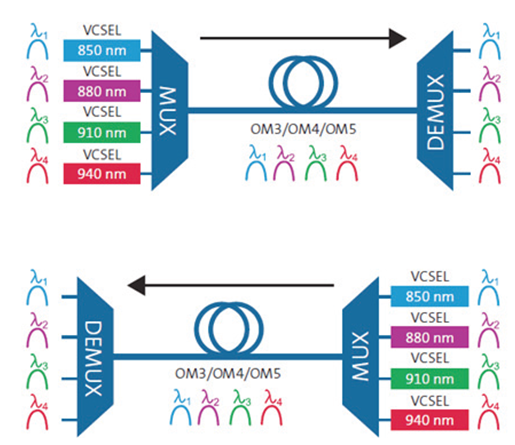 基于IEEE802.3ba制定的40G/100G标准,多模光纤40G的传输采用每对光纤支持10Gbps的速率4*10Gbp=40Gbps,需要用到各4根光纤发送与接收,共8芯光纤,100G采用各4根光纤发送与接收4*25Gbps=100G,共使用8芯光纤。400 Gb/s传输速率需要用到16对共32芯光纤,这对于光纤资源的占用非常大。业界正在探索使用多波长复用的方式来减少光纤的使用数量。