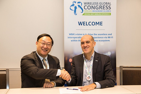 WBA CEO Tiago Rodrigues与华为数据通信产品线园区网络领域副总裁李兴在大会上签署合作文件