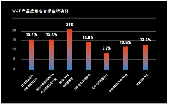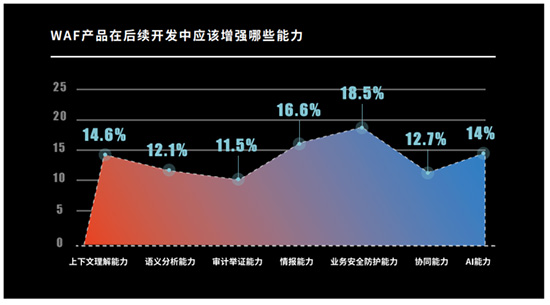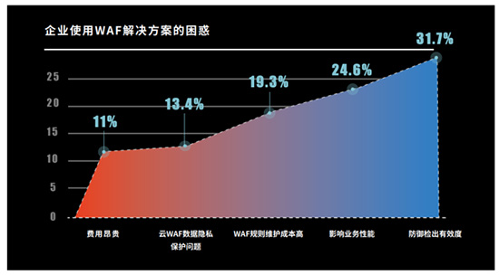 报告指出,虽然目前WAF仍然是抵御Web应用攻击的大头,且大部分企业用户都部署了WAF,但越来越多的企业对WAF的防御检出有效度、影响业务性能、高昂的维护成本等问题并不满意,并提出了对业务安全防护能力、AI能力、协同能力、动态防御功能等方面的需求。