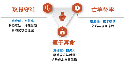 每年都会有很多重大活动,安全保障工作已渐渐成为常态化。但是,目前的安全机制与防护体系真的能让您轻松应对每一次重大活动的安全保障吗(以下简称“重保”)?特别是近几年的安全攻防演练活动中,持续24小时无休的攻击状态、0day漏洞频发、低门槛的自动化工具攻击,造成了“攻易守难”“亡羊补牢”“疲于奔命”的困境。
