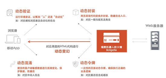凭借“先发制人、掌握先机”的防护哲学,以动态封装、动态验证、动态混淆、动态令牌四大动态安全技术为支撑,不依赖特征库及规则库,动态隐藏攻击入口,主动验证访问真实性,实现防守反击,有效解决零日漏洞攻击、漏洞嗅探攻击、模拟合法用户操作的自动化工具攻击行为。
