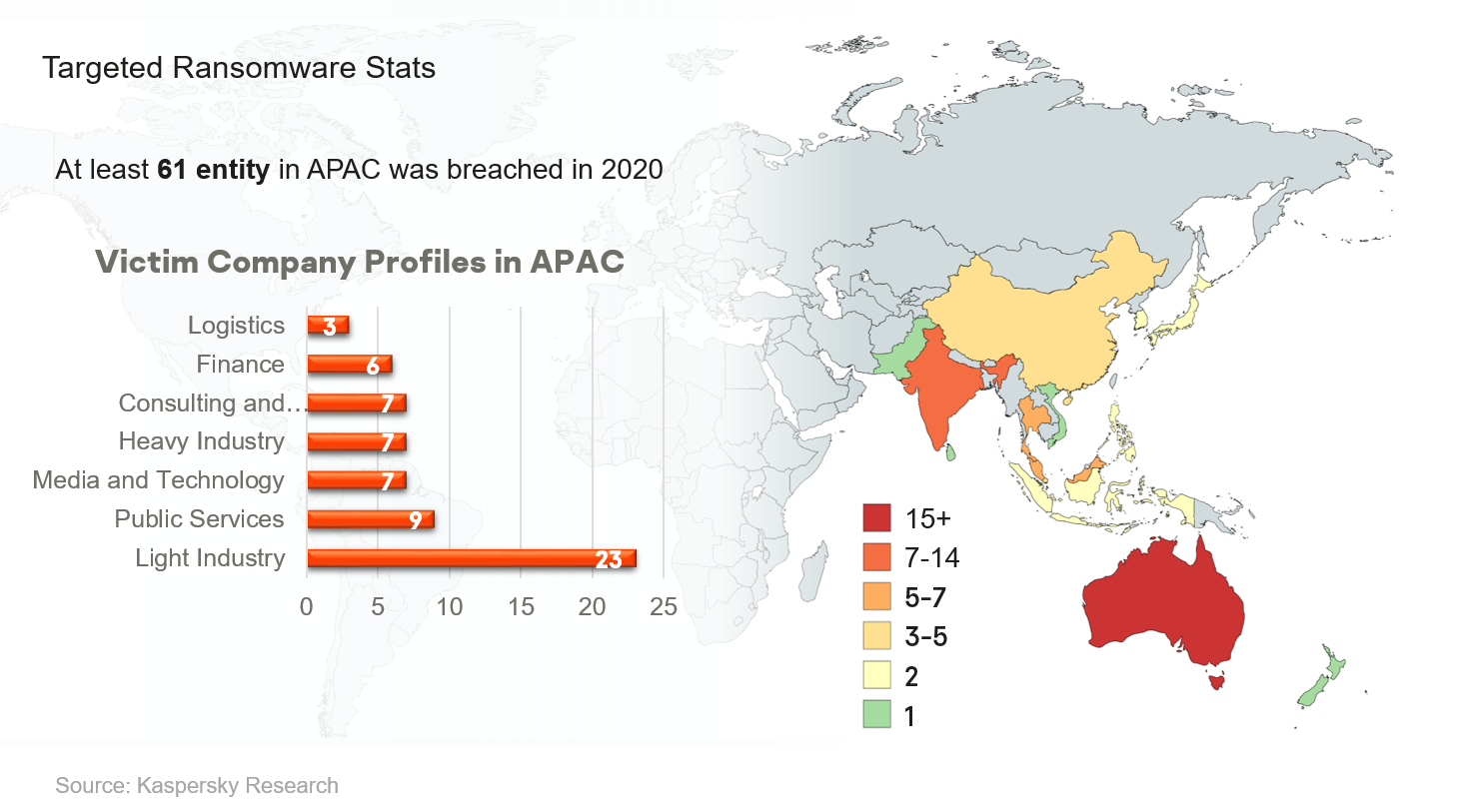 卡巴斯基亚太区全球研究和分析团队(GReAT)总监 Vitaly Kamluk 表示,2020年,该地区至少有61个实体遭到针对性勒索软件组织的攻击。整个亚太区,澳大利亚和印度发生的这类安全事件数量最多。