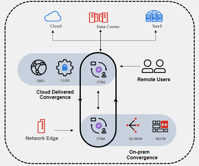 2021年12月,Forrester在Now Tech 研究报告中介绍了一种其称为“一体化(All-in-One)零信任边缘”解决方案。该报告指出,实现跨云、跨软硬件的组网和安全技术高效融合,并采用零信任策略基本防护原则实现用户、数据及资源安全访问的新型组网方法,将成为下一代网络基础设施组网技术的未来趋势。