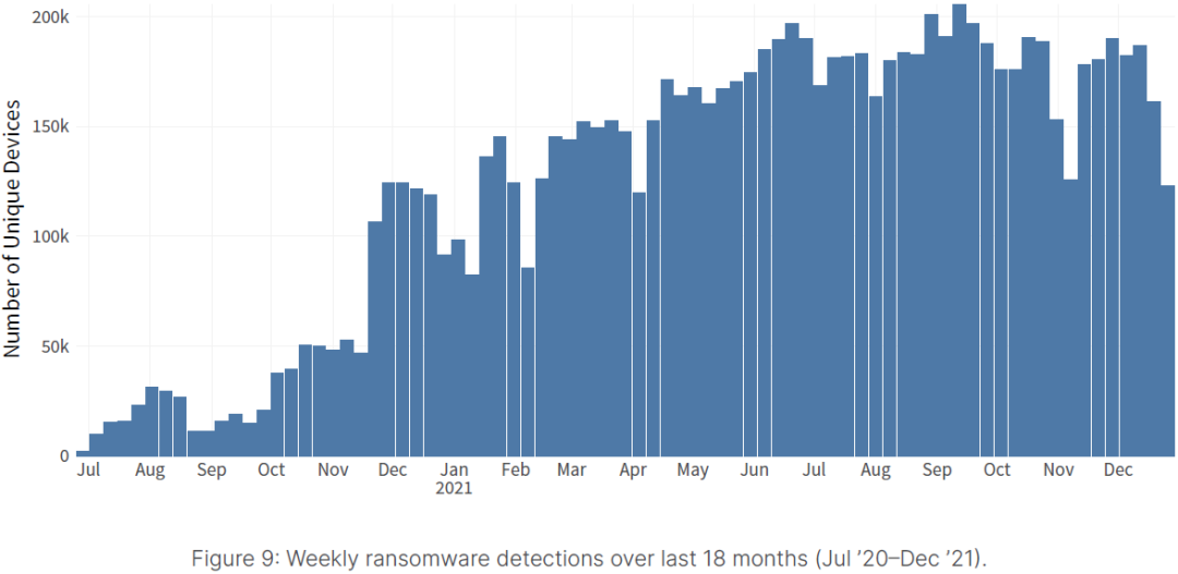 网络犯罪分子快速瞄准攻击面新载体。未来,一些看似不起眼的安全威胁可能释放出巨大的破坏力,这一点应引起持续关注。例如,近期出现的新型恶意软件利用Linux系统漏洞,通过可执行和可链接二进制文件格式(ELF)发起攻击。由于Linux操作系统通常运行着多数网络的后端系统,并为物联网(IoT)设备和任务关键型应用程序提供基于容器的解决方案,这一特性使其逐渐成为网络攻击的热门目标。事实上,随着ELF Muhstik变体、RedXOR恶意软件以及Log4j系列漏洞事件相继将Linux视为主要攻击目标以来,截至2021年第四季度,已发现的新型Linux恶意软件签名率,较第一季度超出4倍之多。与此同时,2021年针对ELF及其他Linux恶意软件的检测较往年也翻了一番。变种病毒数量及攻击范围的极速攀升,意味着以Linux为目标的勒索软件正日益成为网络犯罪分子武器库中运用自如的攻击工具。