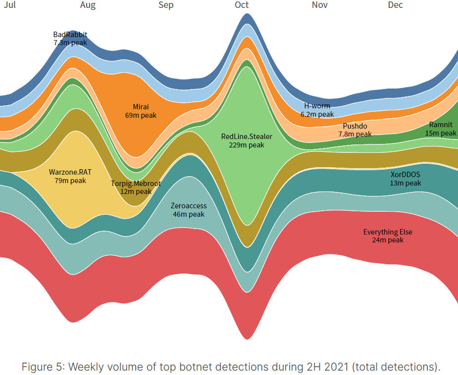 僵尸网络的演变趋势预示着网络攻击技术更加复杂。不断升级、不断进化的新型网络犯罪攻击技术的应用正成为僵尸网络的演进趋势。僵尸网络不再以DDoS的单一体攻击为主,攻击者转而利用捆绑勒索软件在内的多目标攻击工具等更为复杂的攻击技术。例如,包括Mirai等僵尸网络运营商在内的犯罪团伙,还将Log4j漏洞的利用整合至其攻击工具包之中。与此同时,僵尸网络活动还被追踪到与RedXOR恶意软件新变种有关,蓄意攻击Linux操作系统,大肆搜刮和窃取数据。去年10月初,对传播RedLine Stealer恶意软件变体僵尸网络的检测数量也在激增,该变种利用以COVID为主题的文件开展网络钓鱼活动并搜寻新的目标。