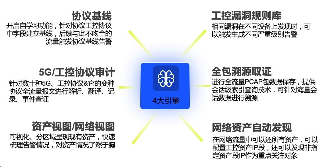 工业全流量溯源与威胁检测系统ICFlow集成协议还原、工业威胁分析、机器学习、漏洞检测“四大引擎”,可支持5G+工业互联网网络流量、工业环境网络流量、云环境网络流量镜像,实时检测5G、MEC、工业环境下的网络攻击、异常行为操作、非法设备接入、病毒横向传播、关键操作行为等,并及时告警提供处置建议和旁路阻断功能。