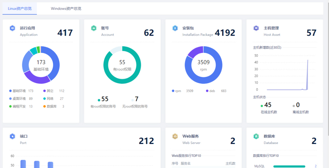 亚信安全信舱DS支持全面收集主机层面资产,包括端口、对内对外IP、web站点、web中间件、web应用、数据库、进程、第三方组件、软件应用、环境变量、计划任务、jar包等;同时可对资产实时监测,基于变更规则(变更频率)进行告警。
