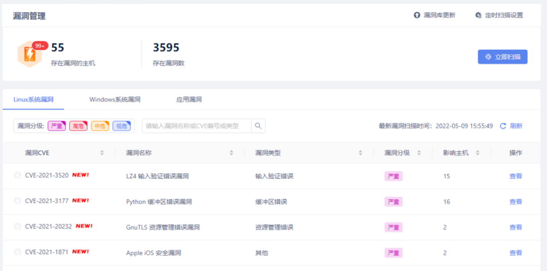 服务器承载各类业务系统,时刻面临着外部的用户访问,一旦存在漏洞,将使得平台被黑客入侵的风险被成倍放大。因此,云安全产品应具备强大的漏洞风险检测及修复能力,需能够对漏洞风险进行精准发现,并针对不同漏洞风险做出精准分析,提供精确到命令的修复建议。