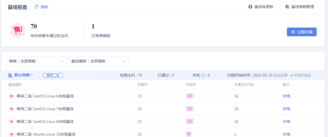 为此,亚信安全信舱DS 20提供了强大的基线检查能力,能够对根据二级等保、三级等保等要求对主机进行统一扫描,支持检测操作系统和服务(数据库、服务器软件、容器等)的账号权限、身份鉴别、密码策略、访问控制、安全审计和入侵防范等安全配置,并提供检测结果,针对存在的风险配置给出加固建议。