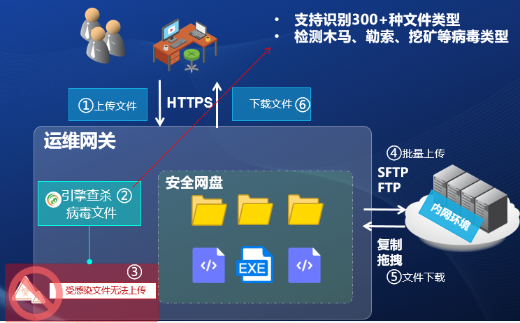 由于远程运维的人员和终端环境无法控制,一旦出现病毒,就可能通过运维入口传到数据中心,造成内网服务器中毒。因此,针对运维人员及远程运维,需要关闭文件传输通道,并通过堡垒机开通安全网盘,将运维文件先传入网盘,并对上传文件检测木马、勒索、挖矿等病毒,这可有效防止病毒文件扩散的风险。