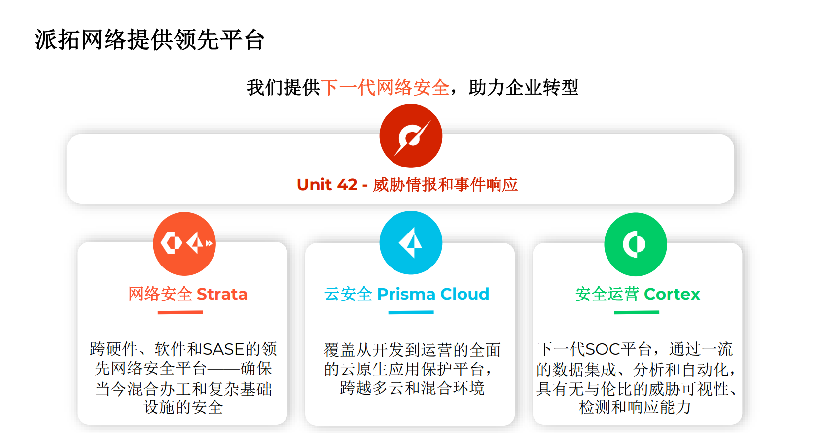 第三,对于企业用户而言,应对新时期网安挑战,还需将整体方案构建成一个具有前瞻性的安全方案。因为安全重在防御,需考虑与安全情报紧密结合等方式。只有这样才能做到防患于未然。在这方面,派拓网络的安全平台是以情报为核心驱动的,可以面向全球各地用户提供最新安全情报,进而能够最大程度地保护用户的网络及数据安全。