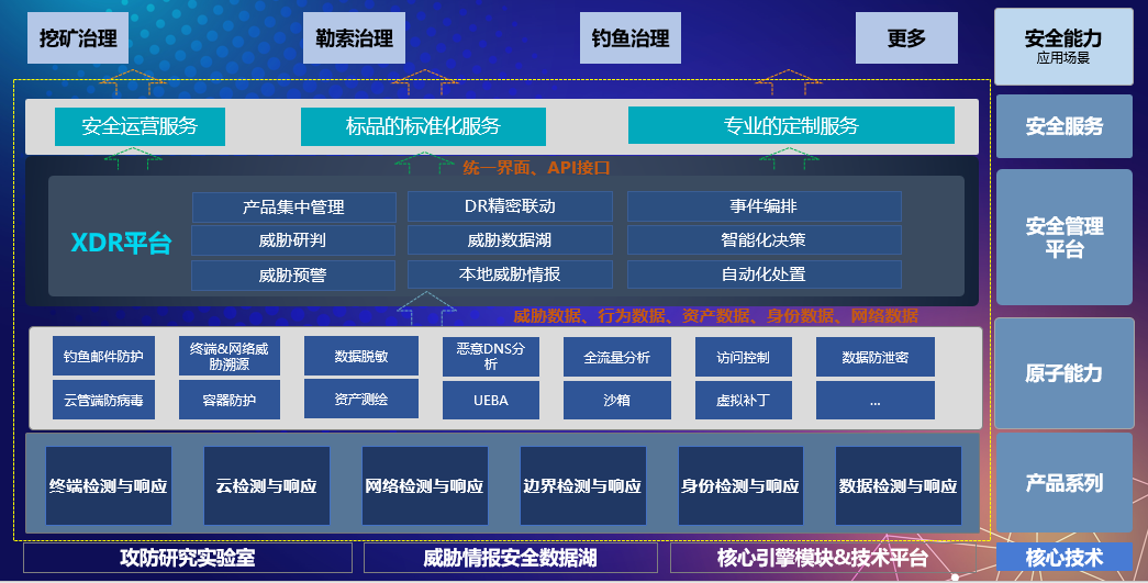 能力造就不凡,今日的XDR市场如火如荼。作为国内率先推广并积极实践XDR的网络安全厂商,亚信安全的XDR解决方案提供了工具化、场景化、服务化和平台化的能力,通过终端、云端、网络、边界、身份、数据的检测与响应,威胁数据、行为数据、资产数据、身份数据、网络数据的原子能力输入给XDR平台,最终形成针对挖矿病毒、勒索软件、钓鱼邮件等全场景的威胁治理覆盖。