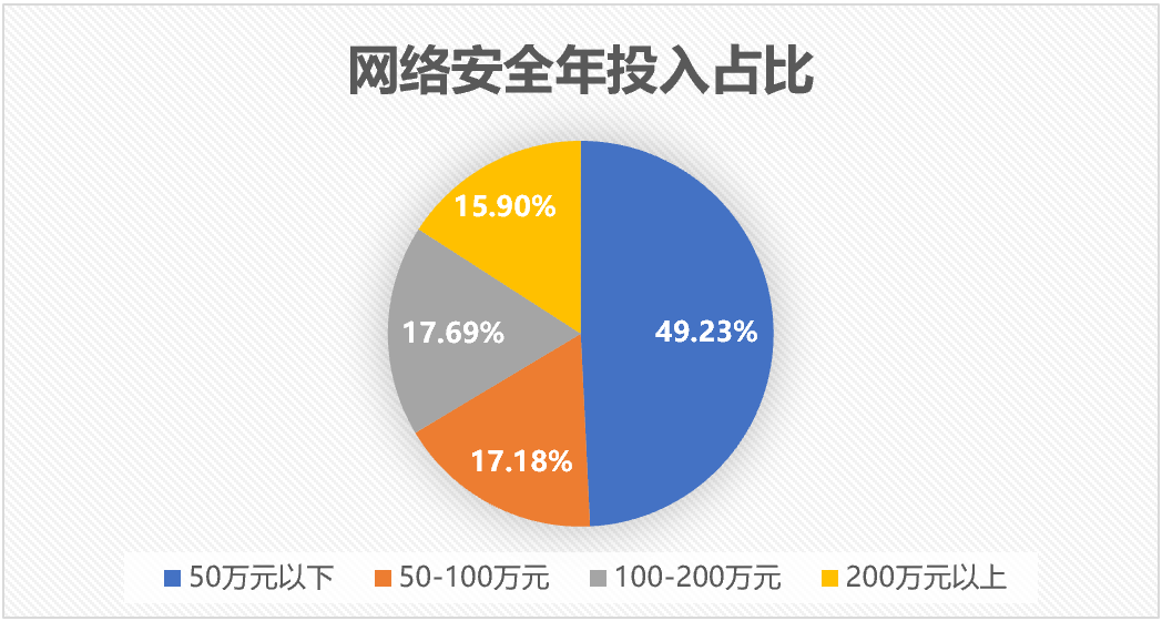 根据《2019-2020年度中国医院信息化状况调查报告》显示,在被调查的390家医院中,网络安全年投入在50-100万元的医院占比17.18%;年投入在100-200万元的医院占比17.69%;年投入200万元以上的医院占比15.9%。