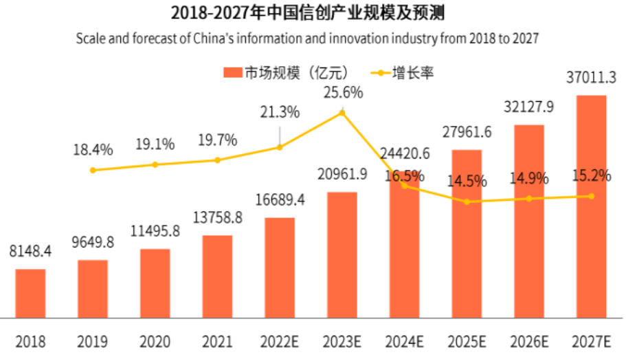 2020-2022年是我国金融信创快速发展的黄金三年。据艾瑞咨询分析,仅2021年,中国信创产业规模达13758.8亿元,2027年有望达到37011.3亿元,中国信创市场释放出前所未有的活力。