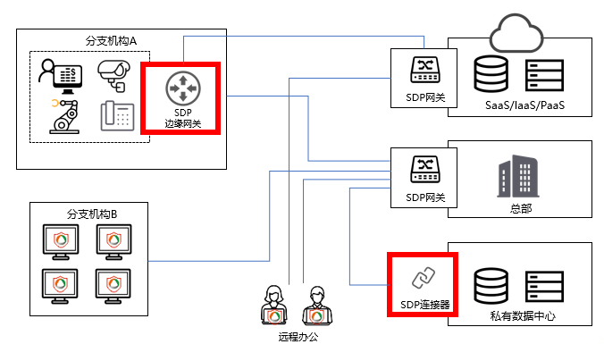 ● 最小授权原则:在现有SDP架构中增加SDP连接器与SDP边缘网关,为用户物联网提供零信任应用,SDP边缘网关用于哑终端设备的数据汇聚点,对不方便安装或无条件安装SDP客户端的办事点、信息采集点等企业业务分支实现最小化授权和加密访问。