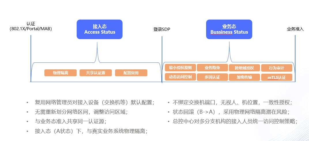 ● 富认证场景:增加802.1X、MAB认证以及桌面端人脸识别场景支持,采用接入态(Access Status)&业务态(Bussiness Status)方式,通过静态访问区域和SDP网关物理隔离技术保护内网资源安全,业务准入后的访问权限不依赖于交换机配置,控制中心无需向交换机端口指配VLAN或ACL,在最大程度地减少横向或东西向通信的同时,对发现潜在的威胁实现状态回滚(B->A)。