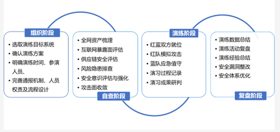 亚信安全实战攻防演练方案分为组织、自查、演练、复盘四大阶段,各阶段具体安排如下: