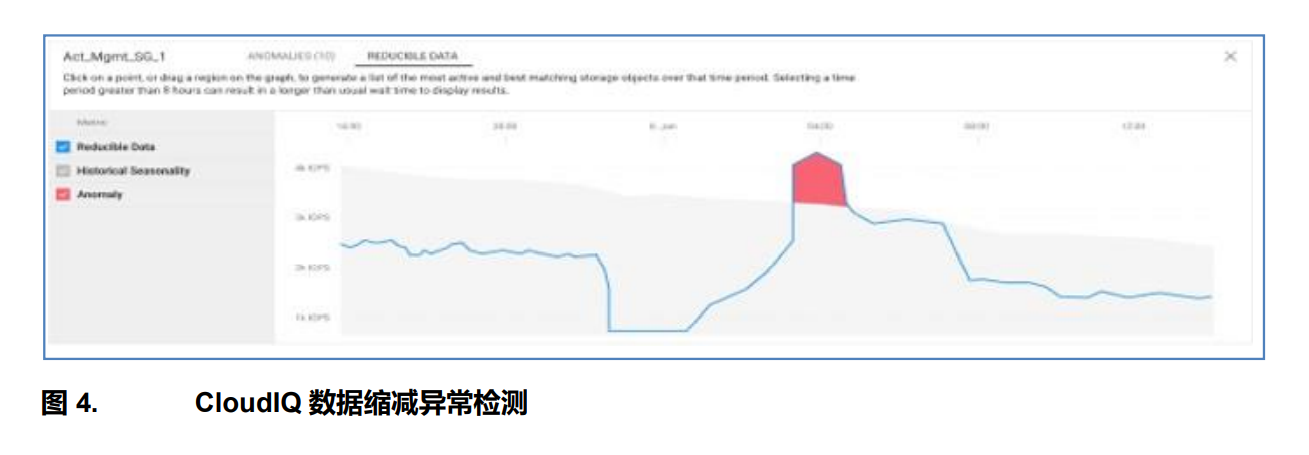 文档中提到CloudIQ有两种异常检测,一种是检测延迟异常,能分析工作负载对延迟的影响,另一种与安全相关,叫“数据缩减异常检测”,如果检测到异常,则可能是有可疑活动或出现了潜在的勒索软件威胁。