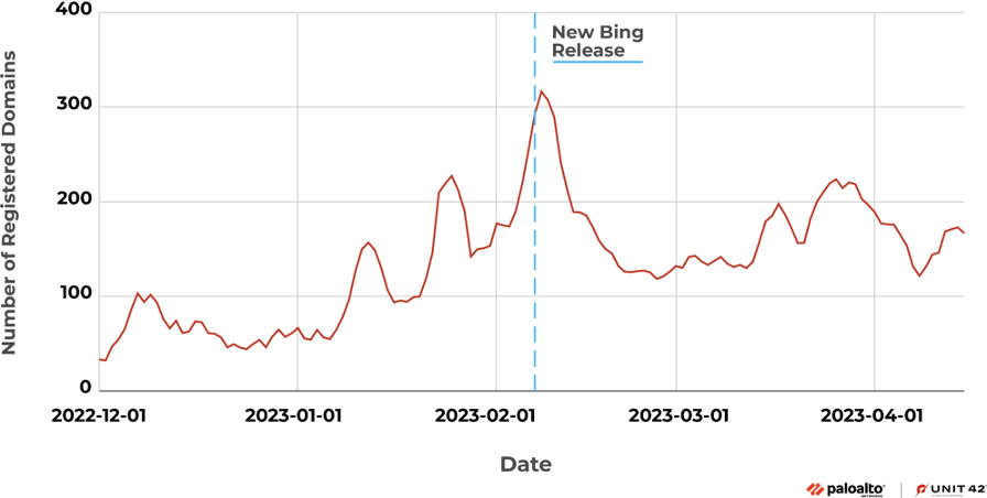 图1展示了ChatGPT问世后相关抢注域名注册的趋势。研究期间,Unit 42注意到每天的域名注册量发生显著上涨。今年2月7日,在微软发布新版必应后不久,就有超过300个与ChatGPT相关的域名被注册。