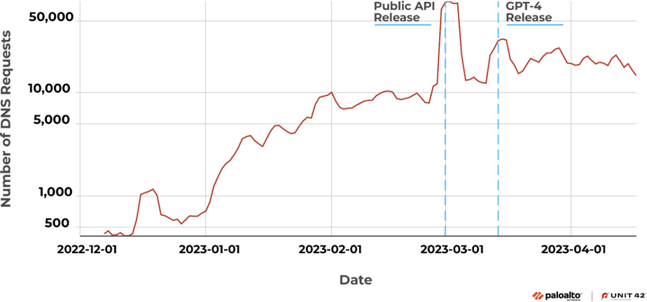 图2的趋势类似,对ChatGPT的接受和普及导致DNS安全服务日志纪录明显增加。