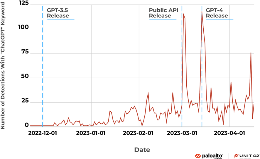 Unit 42还通过高级URL过滤系统进行了关键词搜索。图3显示在OpenAI发布ChatGPT官方API和GPT-4的当天出现了两个明显的上升峰值。