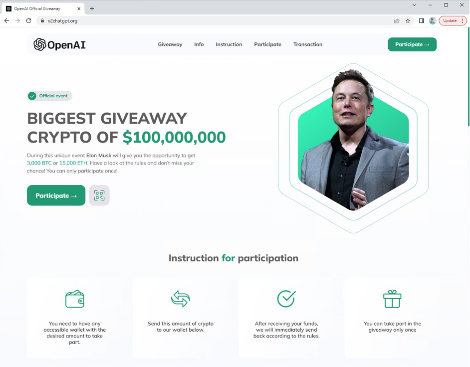 Unit 42还注意到,一些诈骗者利用OpenAI的日益普及进行加密货币诈骗。图6显示的是通过滥用 OpenAI 标志和马斯克的名字吸引受害人参加一项赠送加密货币的欺诈活动。