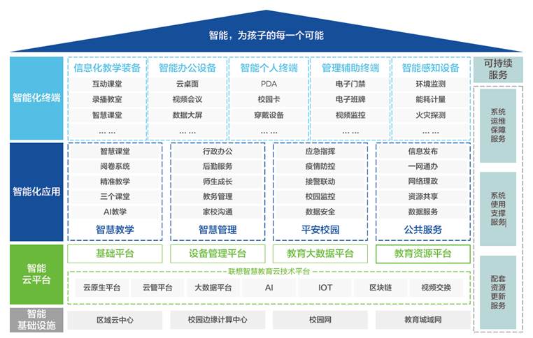 在完善教育信息化“数字底座”的基础之上,联想还通过智慧化的行业应用,推进区域级教学效率与效果,为创建优质公平的教育环境提供信息化平台支撑,帮助各级各类教育用户探索符合自身特色的智慧发展之路。联想已打造出五大教育行业场景方案,在K12阶段包括区域智慧教育云、平安校园、智慧校园等三大解决方案,在高校/高职场景包括校园大脑和智慧实验室解决方案,全面发挥了联想构建端到端“互联网+”教育方案、多场景深度融合教育大脑、整合案例创新产教融合、Open+生态持续教育创新、全国快速运维保障服务体系等五大教育行业方案价值。