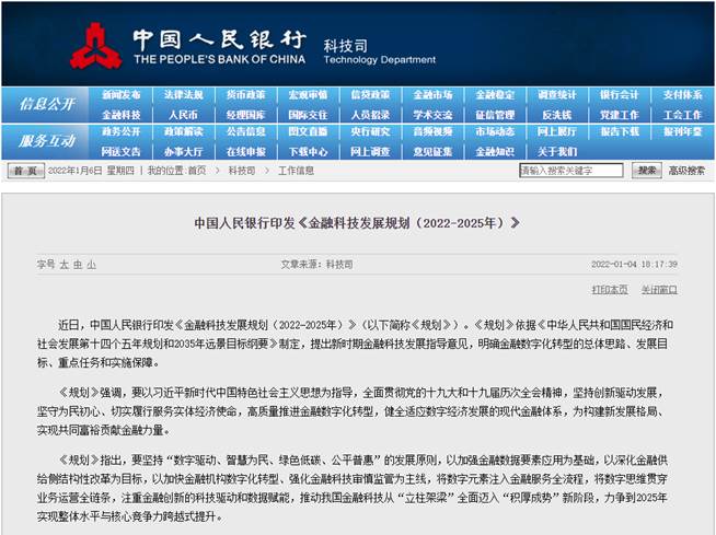 中国人民银行印发《金融科技发展规划(2022-2025年)》