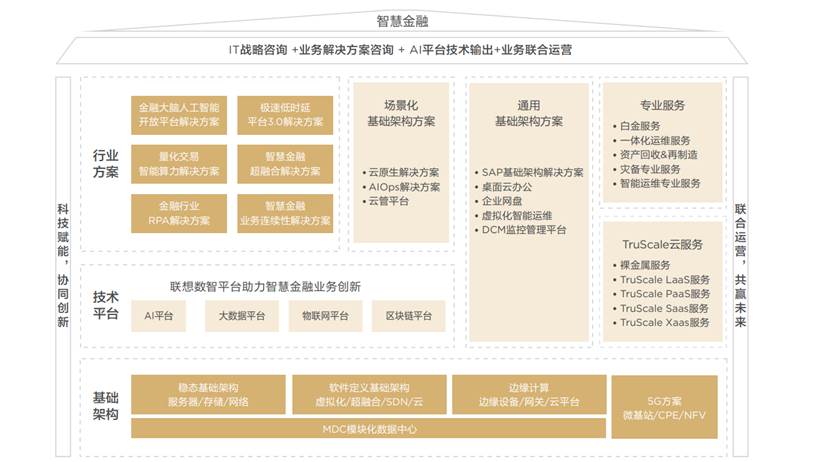 在全行业通用方案方面,联想提供了包括容器云平台、微服务平台在内的云原生方案,智能运维方案(AIOps)、联想云管平台(CMP)的场景化基础架构方案;以及SAP、桌面云、企业网盘、虚拟化智能运维、DCM监控管理平台等通用基础架构方案。配合联想多云管理、资产回收、架构优化等全生命周期的全栈支持服务和TruScale的一站订阅式创新服务,为金融客户的数字化转型提供全链路支持。