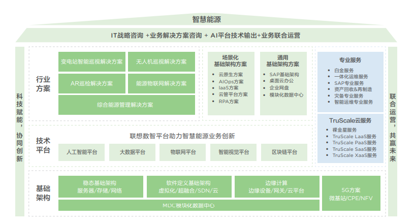 为帮助能源行业应对上述难题,联想将自身方案进行优化整合,提出整体的能源行业方案体系——具体由基础架构产品、基础架构方案、通用技术平台方案、行业场景方案以及专业服务五大部分组成。