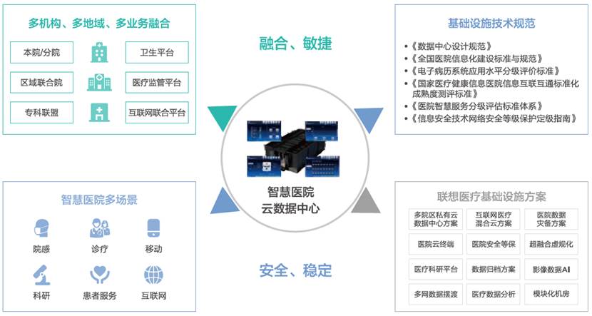 针对底层的基础架构,联想对医院的数据中心基础设施进行了多维度的分析与研究,并结合当今医院多园区、多地域、多业务融合的特点,进行整体布局。联想指出,医院的数据中心建设需要有一套完整的建设思路,不同的机房类型需要不同的解决方案去对应,业务系统、容灾系统、科研系统,都有机房环境、带宽、计算以及存储容量的不同要求。联想已根据这些特色,总结出不同的场景方案组合,满足各类客户多样化需求。