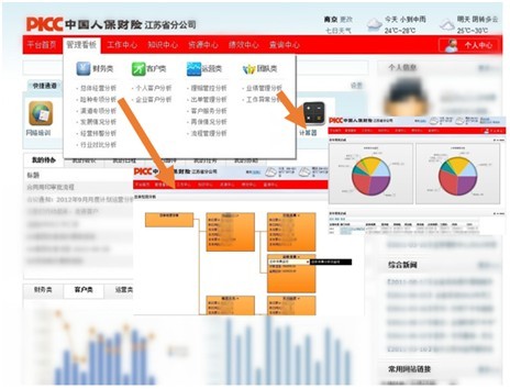 摘要:江苏PICC依托泛微协同OA平台,从保单管理系统、数据分析系统、财务系统等多个系统中抓取数据,最终以“管理看板”的形式,为管理者提供从财务、客户、运营、团队等维度全面透视公司的报表呈现。