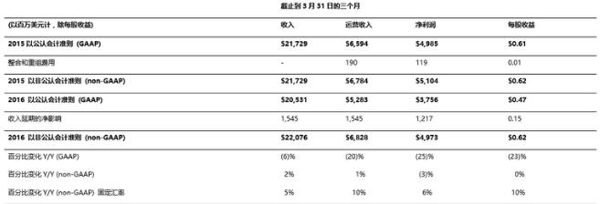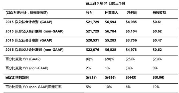 在 2016 财年的第三季度里,按照通用的美国公认会计准则(GAAP)统计的收入、运营收入、净利润以及每股收益反映了营收延期的影响。在 2015 财年的第三季度里,以公认会计准则(GAAP)运营收入、净利润以及每股收益是对重组开支相关费用的确认。这些事项定义如下。除了这些依照公认会计准则(GAAP)呈现的财务业绩,微软也通过提供按照非公认会计准则(Non-GAAP)核准的信息,来帮助投资者更好地了解微软的业务表现。展示这些美国非公认会计准则(Non-GAAP)呈现的财务数据将为投资者提供额外洞察以更好地了解微软的运营表现,并有助于阐明影响公司业务的趋势。作为比较性报告,管理层在评估经营业绩时,将此信息和公认会计准则(GAAP)数额一并纳入考量范围。美国非公认会计准则(Non-GAAP)呈现的财务数据不应被视为对美国公认会计准则(GAAP)核准的财务表现的替代或优化。